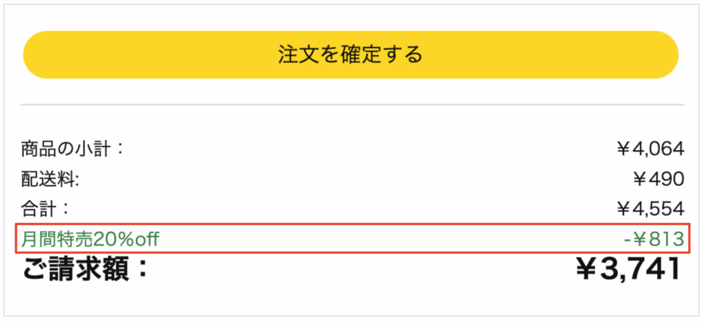 さらに「◯点買うと 20%OFF」「実質1個無料」となるお得な商品も多数あります。セール対象商品は注文確定時に割引が適用されるため、注文確定画面で割引額が差し引かれていることを確認してから注文を確定しましょう。