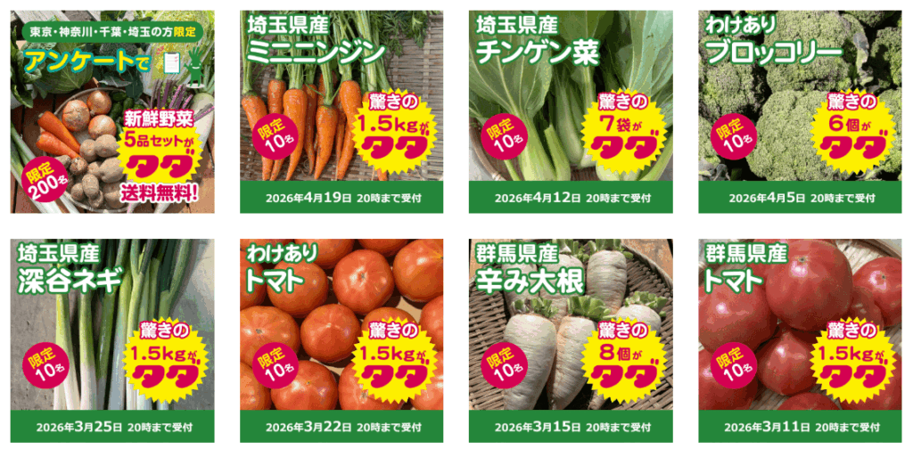 また、アンケートに回答すると新鮮野菜5品セットが当たるキャンペーンにも応募してみましたが、こちらも当選の連絡はありませんでした。「限定200名」と記載されているものの、期間や締め切りが明記されていないため、応募が有効なのか少しわかりにくさが残ります。